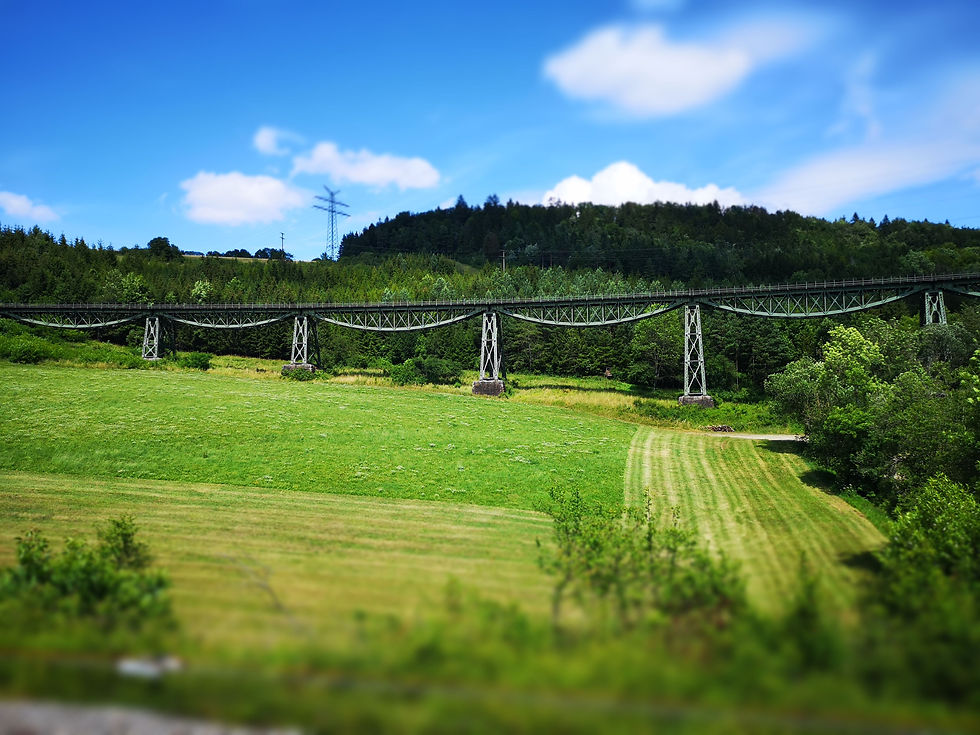 Von Blumberg kommend erreicht man zuerst das Biesenbach Viaduct, sieht aber hinüber zur Talüberquerung Epfenhofen und dann erreicht man die Talüberquerung Epfenhofen und schaut auf das Biesenbach Viaduct